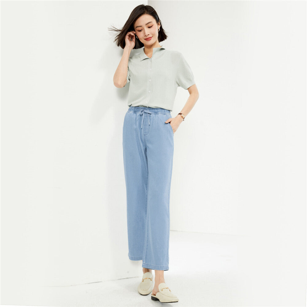 These Light Wash Blue Paperbag Crop Leg Trousers are a great choice for your summer outfits. Made from a light and breezy fabric, they are comfy and easy to wear. The high, stretchy paperbag waist looks good and works well for different styles. With two side pockets and a classic denim look, you can dress them up with a tucked-in blouse and heels for a stylish office outfit, or wear them with a graphic tee and sneakers for a relaxed day out.